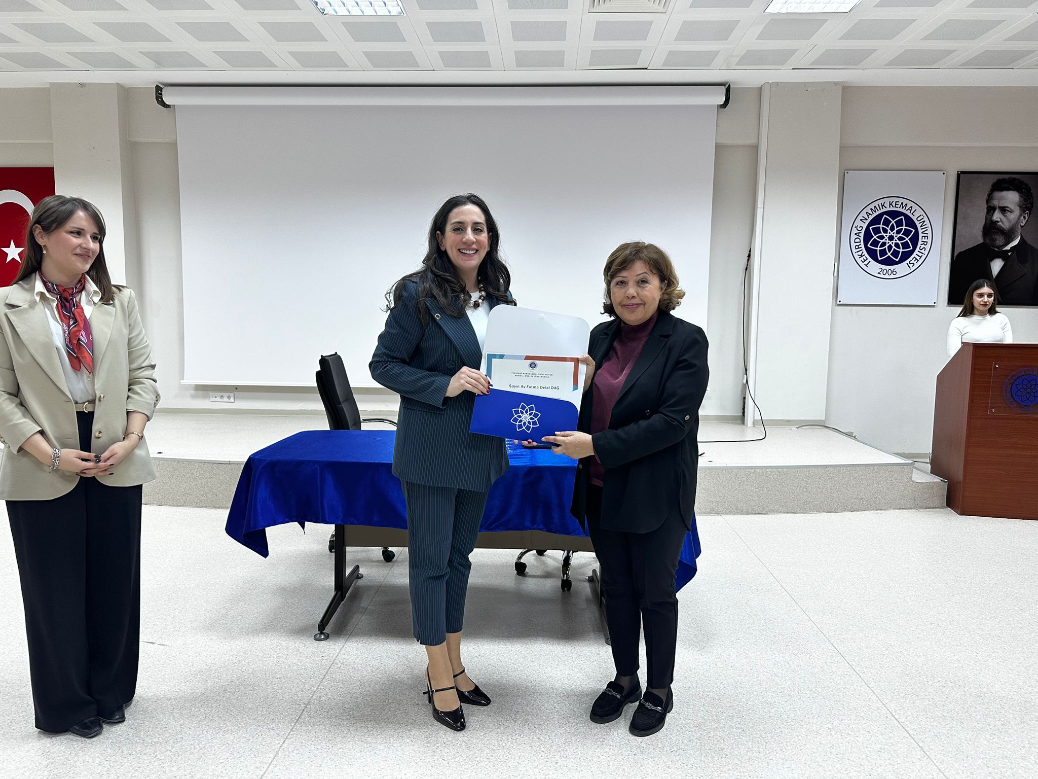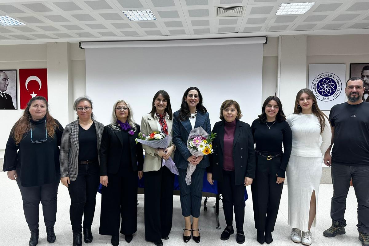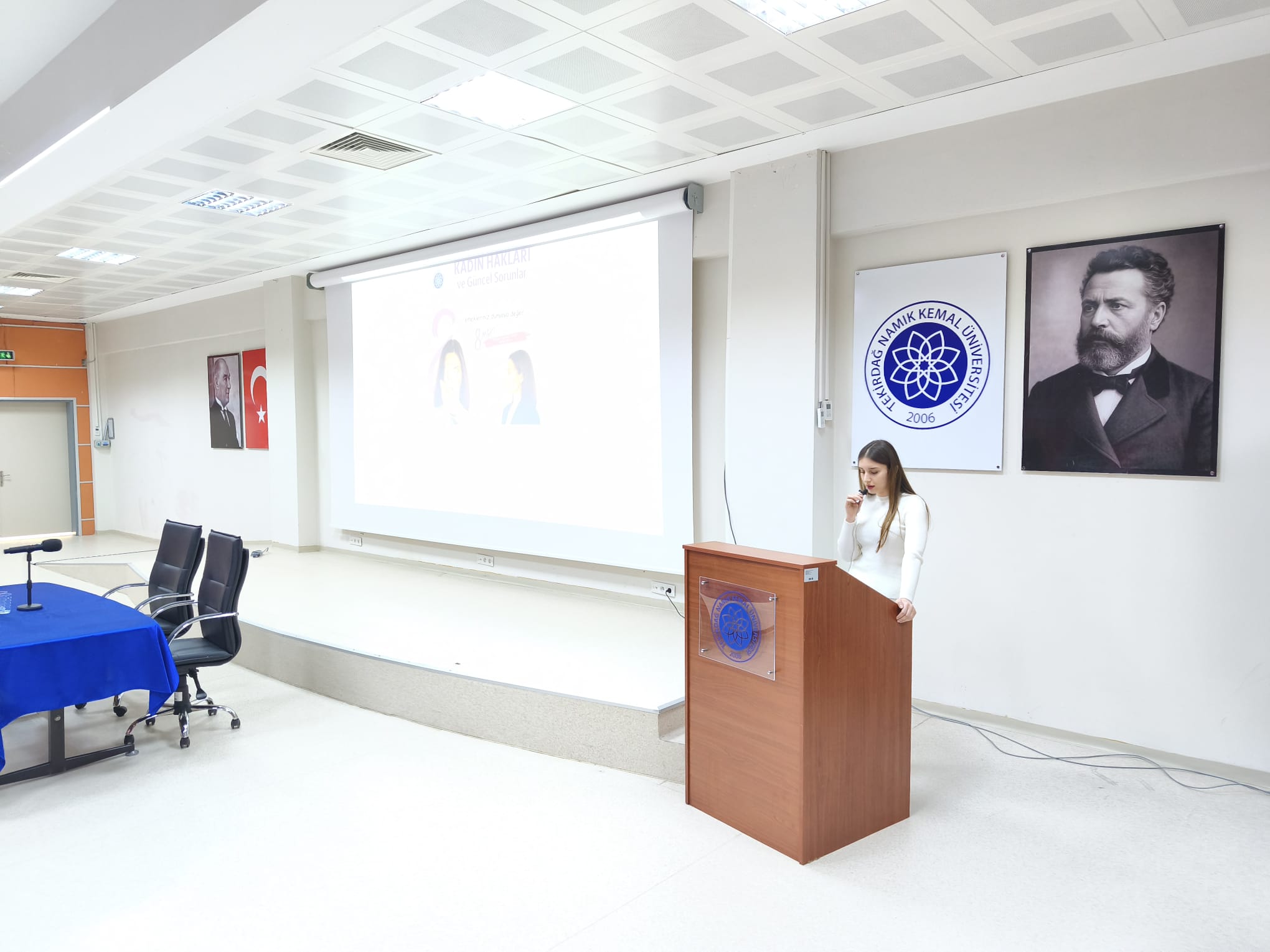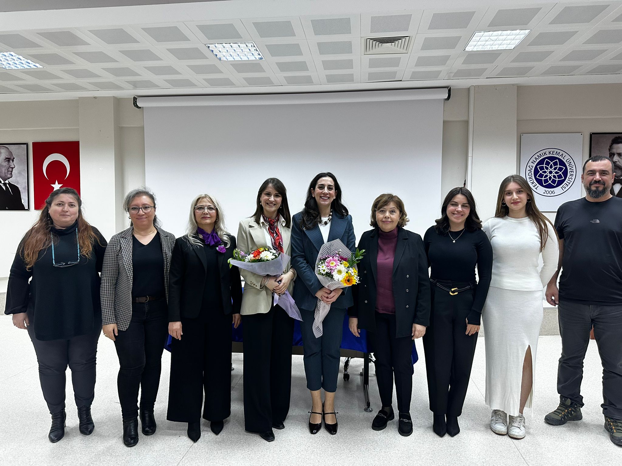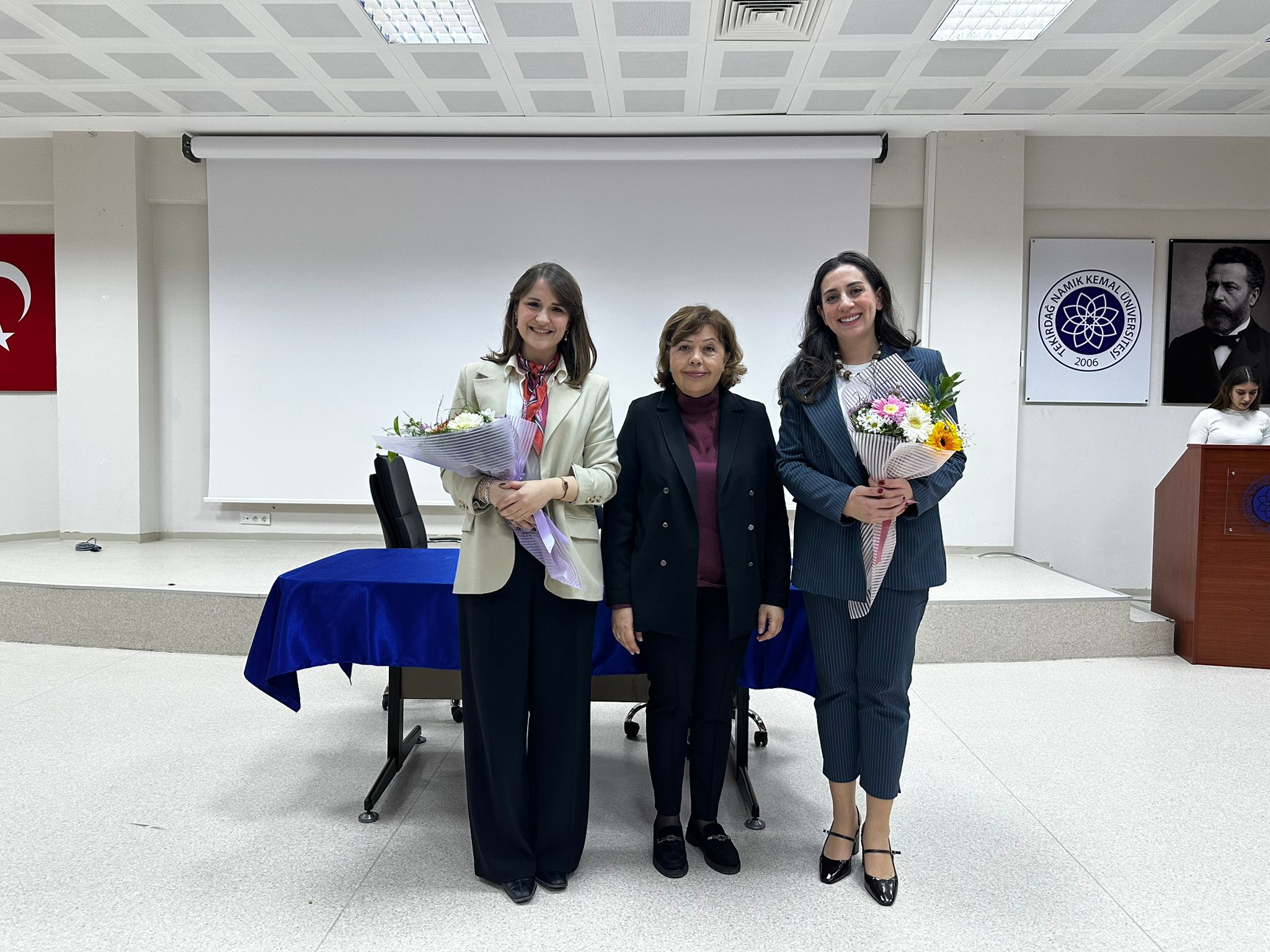 Konferansa, Tekirdağ Barosu avukatlarından Sayın Fatma Delal Dağ ve Sayın Kübra Çalışkan konuşmacı olarak katılmışlar ve 8 Mart Dünya Kadınlar Günü’nün tarihçesi, kadına yönelik şiddet, şiddet mağdurları açısından hukuki süreçler, iş yaşamında kadınların karşı karşıya kaldığı sorunlar üzerine değerli bilgi ve tecrübelerini bizlerle paylaşmışlardır.